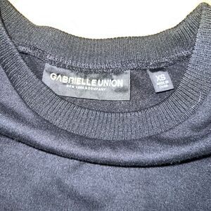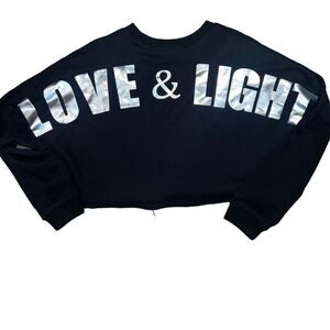 A pre-owned black cropped sweatshirt by Gabrielle Union New York & Company. The sweatshirt features a silver foil print on the back that reads "LOVE & LIGHT." It has a crew neckline and long sleeves with ribbed cuffs. The sweatshirt is made of a soft, comfortable cotton blend fabric. The size is XS. The sweatshirt is in good condition with no visible signs of wear or damage. The measurements are: Length: 17 inches, Bust: 34 inches, Sleeve Length: 24 inches.