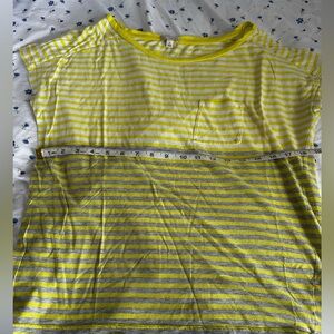 Women's Gap Cap Sleeve Medium Basic T Shirt Yellow White Grey Stripes. Flat front pocket. Small hole neat hem noted in photos. Otherwise in great condition. Light and airy, thin tee. Great for summer. Please see pictures for measurements.