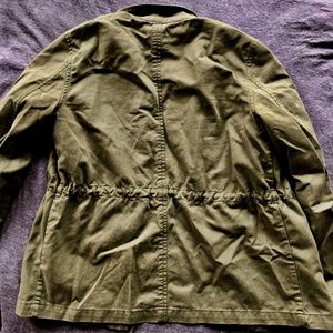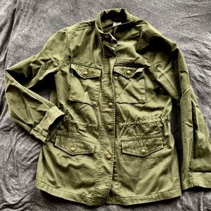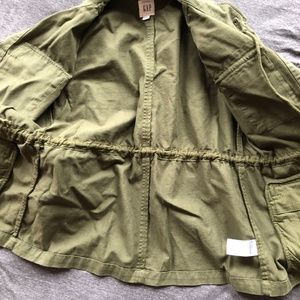 EUC (like new--worn only a handful of times) from smoke-free, pet-free home. Gap Smooth twill weave. Patch detailing at long sleeves, button cuffs. Stand collar, hidden zip and button front. Front snap flap utility pockets. Interior drawcord at waist. Straight silhouette with a cinched waist, easy fit. Hits at the upper thigh. Model is 5'10"/178 cm, bust 31. 5"/80 cm, waist 24"/61 cm, hips 35"/89 cm, wearing a regular Gap size S.