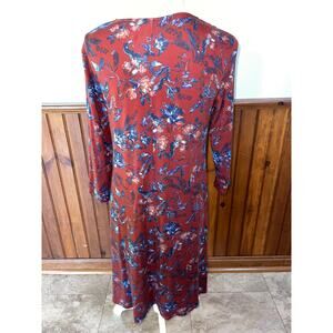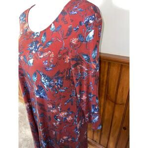 This dress is in excellent pre-loved condition, no rips or stains! It is a soft, jersey knit floral swing dress! The color is maroon, and the floral design is blue and white. The sleeves are 3/4 in length. This is perfect to wear in the summer and into the fall! Measurements in photos. Womens size small!