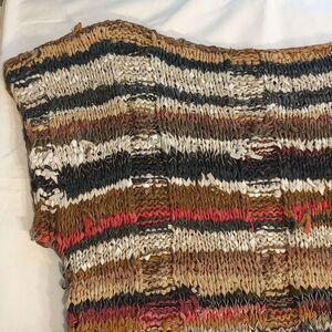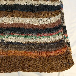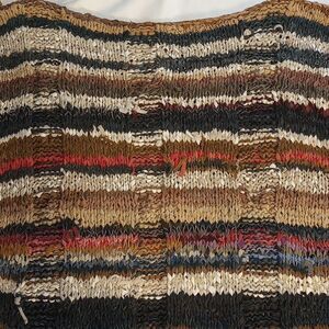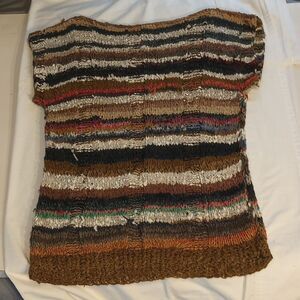 I've never seen a shirt quite like this! It is a women’s genuine leather hand knitted multi colored tee shirt. It doesn't have a tag, but it looks like a women's small. The measurements are from armpit to armpit 17 inches, and from the shoulder to the bottom of the shirt, 26 inches. It was made in Turkey.