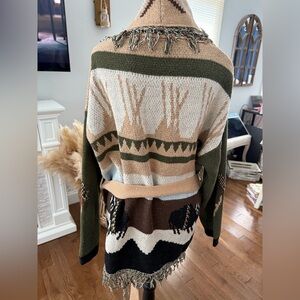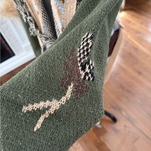 Stay cozy and stylish with this women's geometric knit cardigan. Featuring a blend of green and tan colors, this cardigan is perfect for layering. Its unique design adds a touch of elegance to any outfit.