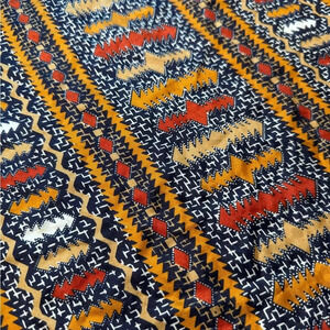 Faux-silk square neck scarf/hair wrap with blue, red and orange geometric patterning