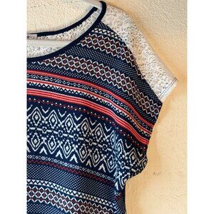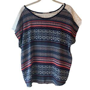 Womens Geometric Print Short Sleeve Top With Lace Shoulder Detail Large READ