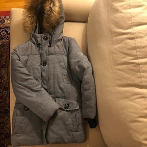 faux fur hood, thigh length, VERY lightly used