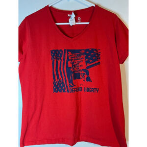 This is a pre-owned Gildan Heavy Cotton red t-shirt, size extra large. The shirt features a v-neck and short sleeves. The front has a graphic with an American flag and the words "Defend Liberty." The back displays "Unitarian Universalism Front Line Faith" with a similar flag design. There are no visible stains or tears. The fabric shows slight signs of wear, consistent with pre-owned condition.
