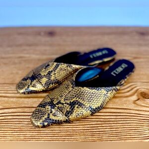 Women’s Gold And Black Flat Snake Print Mules Slip On Workwear Shoes Sz 6