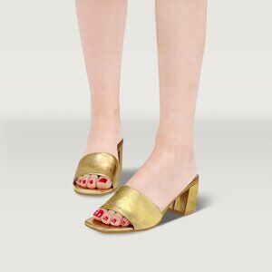 Women's Gold Low Chunky Block Square Open Toe Heeled Sandal Slip on Mules Shoes