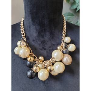 Women's Gold Pearl Black Beaded Necklace Lobster Clasp Chunky Statement