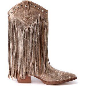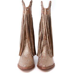 These cowboy - style boots feature a rhinestone - encrusted upper. Long, dangling fringes adorn the shaft, adding a dynamic flair. They have a low - to - medium block heel, offering both stability and a slight height boost.