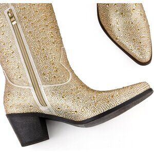 ⚡Women’s Gold Rhinestone Cowboy Boots Mid Calf Pointed Toe Sparkly Block Heel