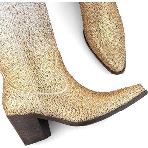 ⚡Women’s Gold Silver Rhinestone Cowboy Boots Mid Calf Pointed Toe Block Heel
