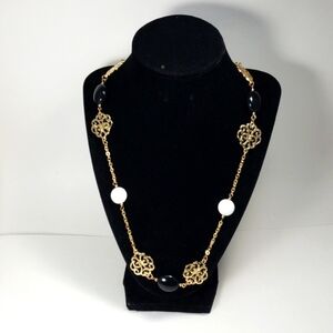 Women's Gold Statement 38" Long Necklace w/ Black, White Beads & Filigree Discs