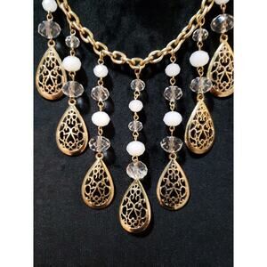 Womens Gold Tone Glass Acrylic Beads Filigree Teardrop Fringe Statement Necklace.