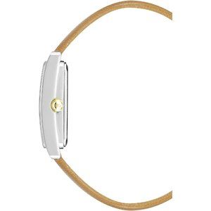 Curved mineral crystal lens; light champagne dial with gold-tone hands and markers Black genuine leather strap with buckle closure Band length: 8.5 inches Japanese quartz movement Case diameter: 28 millimeters Water resistant to 30 meters (99 feet): In general, withstands splashes or brief immersion in water, but not suitable for swimming or bathing