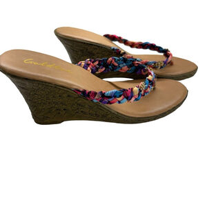 These are pre-owned Goldtoe wedge sandals. They are a size 7 and have a 3 inch heel. The sandals are made of a woven fabric with rhinestones and have a cork-like wedge heel. They are in good condition.