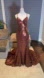 This dress is very eye catching! The sequins sparkle as you move. It has a low back with cross over spaghetti straps.