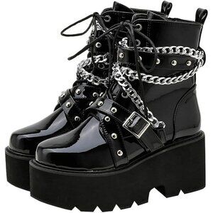 ⭐Womens Goth Patent Ankle Boots Platform Chunky High Heel Lace Up Combat Boots.