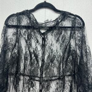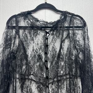 Womens babydoll black lace top. Back button down with hook & eye closure. 3/4 puff sleeves with buttoned hem. Lightweight. Collar has missing lace (please see pic), but goes with the style. In good used condition. No stains, tears or holes.