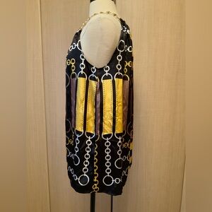 This relaxed top showcases a bold graphic design in black, brown, white and gold, perfect for making a statement. The sleeveless chain link design style is eye catching and it makes this top a closet staple.
