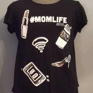 Justice - "#MOMLIFE" shirt - size XL - black - short sleeve - graphics include lipstick, coffee cup, wi-fi symbol, high heel shoe, and a cell phone - cotton/polyester blend - non smoking seller