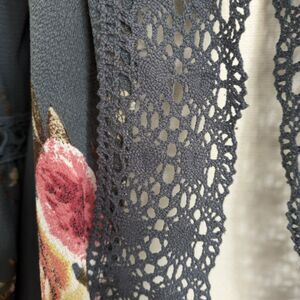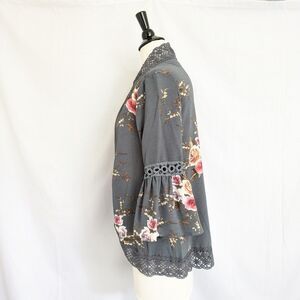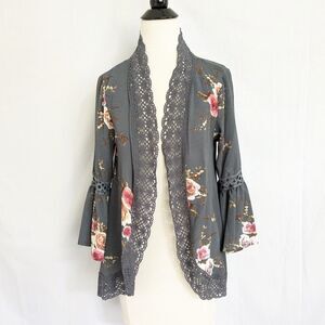 Women's Gray Cardigan Size S Floral Crochet Lace Open Front 3/4 Bell Sleeve