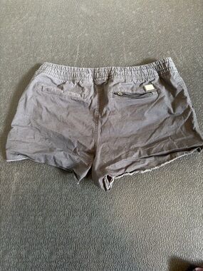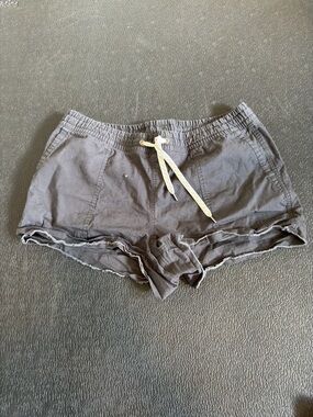 Soft gray casual shorts with an adjustable drawstring waist. Lightweight fabric and relaxed fit for everyday comfort. Features side pockets and a frayed hem for a laid-back look. Easy to pair with tees and tanks.