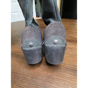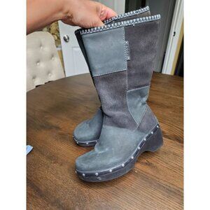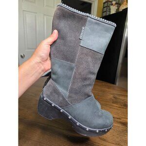Womens Gray Leather & Suede Tall Boots With Studded Platform Heels