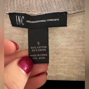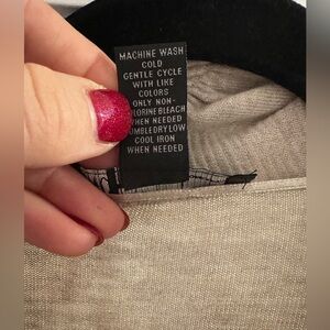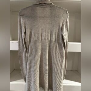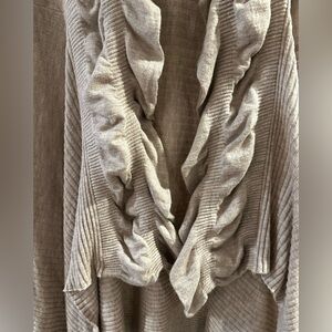 ⭐️ : Cream/lite Gray ruffle cardigan with long sleeves. Front is longer than back.