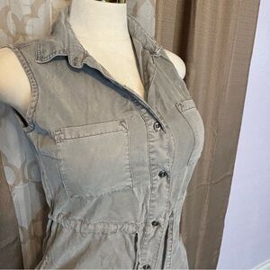 Elevate your wardrobe with this stylish gray sleeveless button-down top. Perfect for casual outings or a day at the office. Enjoy comfort and style in one piece.