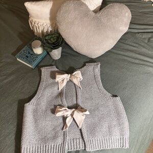 Women’s light gray sleeveless knit sweater vest. Back features a cutout, with is connected by two large silk white bows. Stretchy knit material, 60% Cotton and 40% acrylic.
