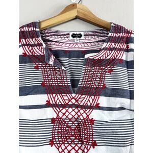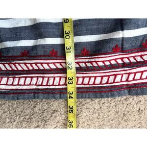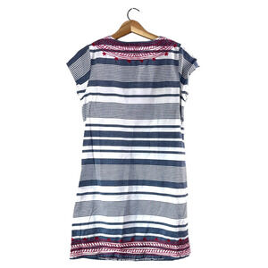 Gray and white striped dress Short sleeve dress Embroidered red neckline IN good condition See photos for measurements