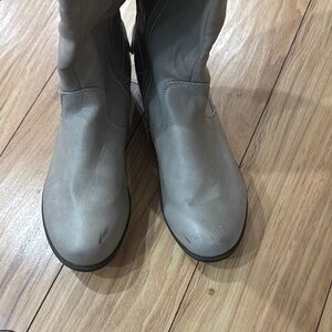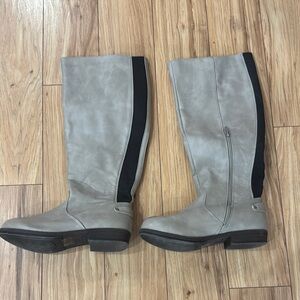 Step out in style with these chic knee-high boots. Featuring a sleek gray design with a contrasting black stripe, these boots are perfect for any occasion.
