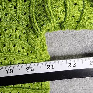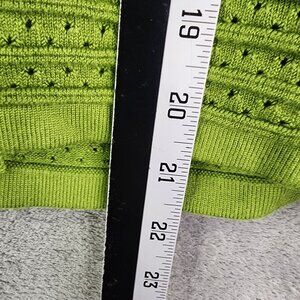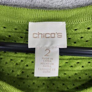 This Chico's cardigan combines style with comfort, featuring an open-weave design in a vibrant green hue. Made from a blend of rayon, nylon, and spandex, this short-sleeve sweater offers a breathable fit with added stretch for ease of movement. Ideal for layering.