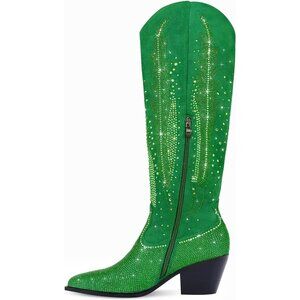 ⚡Women's Green Cowgirl Western Boots Rhinestone Bling Pointed Toe Chunky Heel