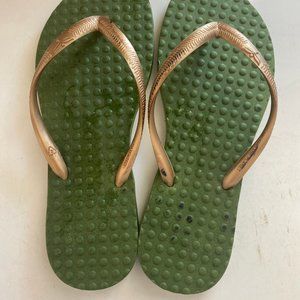 New - Army Green sole with Golden straps recyclable flip flop, made with plant based plasticizers , active grip and slip resistant sole. When wearing this the recommendation is if you are a half size they suggest you size up. These are brand new, however there is a black scuff mark you can see in the picture on the gold strap and the sole on the right foot. These were like this when I bought them and didn't realize it until later.