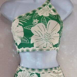 Design: It boasts a trendy one-shoulder top with a stylish, eye-catching green and white floral print.