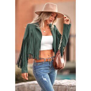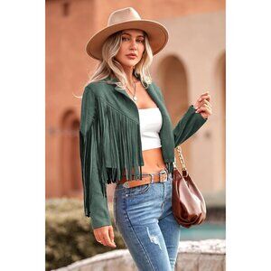 Women's Green Fringe Faux Suede Leather Tassel Motorcycle Cropped Jackets