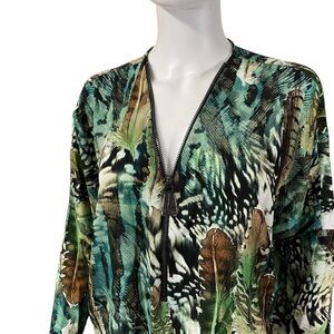 Green Full Zip Feather Print Long Sleeve Blouse Top Condition:New