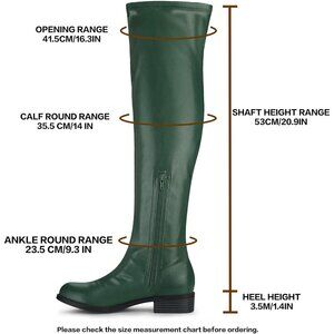 Heel Height: 1 3/8 inches, Shaft Height: 20 7/8 inches; Calf circumferences: 14 inches (The circumference difference of each size cylinder is 1/3 inches)
