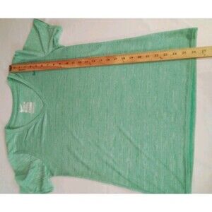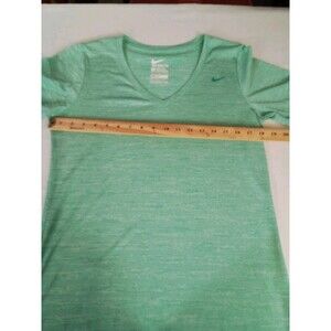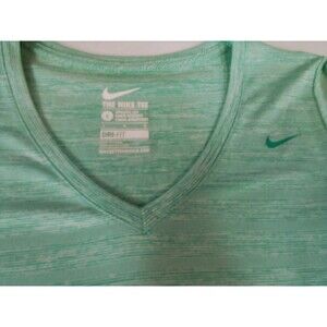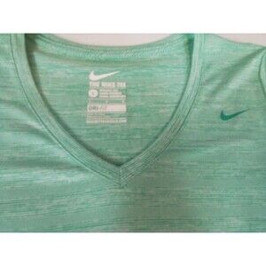 The product is a women's green Nike Dry Fit t-shirt with a V-neck in size large. This activewear top is designed specifically for women, with a regular fit and a flattering neckline. The green color adds a pop of color to any workout or casual outfit, while the Nike brand ensures high-quality and comfort. Perfect for staying active and stylish while on the go.Pet free smoke-free home
