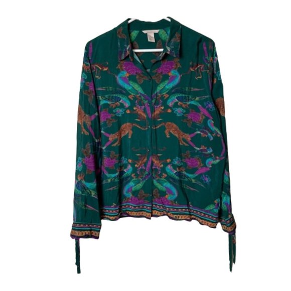 Stylish women's top featuring a vibrant green pattern. Perfect for adding a pop of color to your wardrobe.