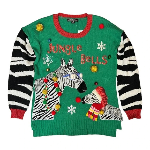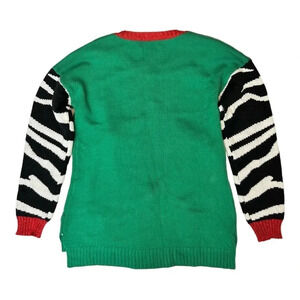 Women’s Green Sequin Embellished Pom Zebra Christmas Holiday Sweater Size M