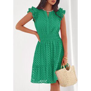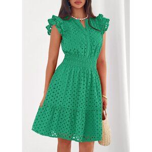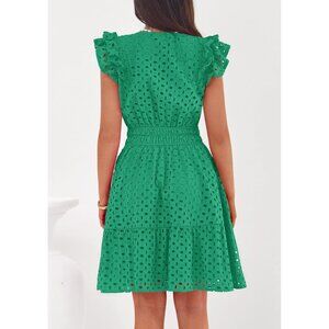 Women's Green V Neck Eyelet Cap Sleeve Summer Beach Vacation Sundresseses