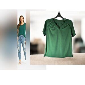 Refresh your wardrobe with this versatile green V-neck top for women, size Medium. This piece is new without tags (NWOT) and perfect for all seasons—spring, summer, fall, and winter. The solid green color and classic V-neckline make it ideal for casual wear, brunch dates, or even a laid-back party look.