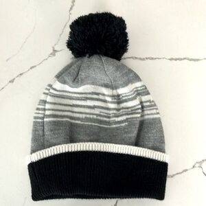 Women’s Grey Black White Striped Knit Winter Snow Hat with Pom Beanie