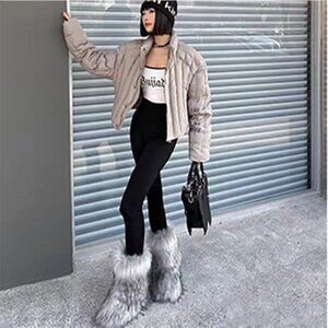 ⚡Women's Grey Faux Fur Warm Boot Furry Short Snow Boot Mid Calf Boots