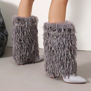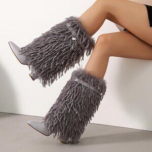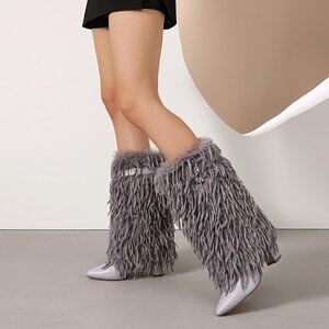 ⚡Women's Grey Fold Over Faux Fur Mid Calf Boots Chunky Heel Point Toe