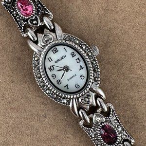 Gruen Watch with Crystal Accents Women's Silver Tone Art Deco set with Marcasite and Colorful Gems Excellent condition, stainless steel back case is 1x3/4 inch wide new length is 7.2 inch battery installed services GR2096LS Japan Movement