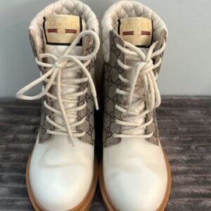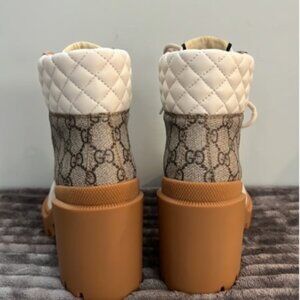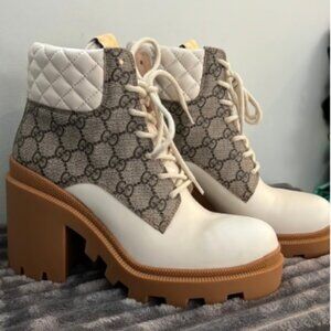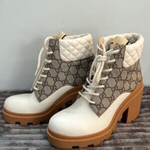 Elevate your shoe collection with these NIB Authentic Gucci Women's Lace Up Heeled Ankle Boots. The white canvas coated upper material is accented with quilted detailing, making them a stylish addition to any outfit. The lace-up closure ensures a secure fit, while the ankle height adds an extra touch of sophistication.These boots are perfect for any occasion, from a day out with friends to a formal event. With a US shoe size of 8 and EU shoe size of 38